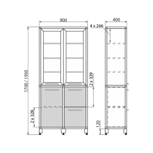 Верхнее отделение закрывается двумя стеклянными дверками в алюминиевой рамке. Стекло толщиной 4 мм обеспечивает обзор, а алюминиевая рамка сохраняет жёсткость створок и визуально «облегчает» шкаф, что особенно уместно в небольших кабинетах.