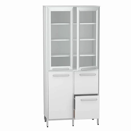 Нижняя часть шкафа рассчитана на интенсивную повседневную нагрузку. Здесь предусмотрены одна распашная дверь и два вместительных выдвижных ящика. Фасад выполнен из оцинкованной стали с порошковым покрытием белого цвета RAL 9016 TXTS, а сама конструкция фасада — в формате сэндвич-панели с шумоизоляцией: закрывание получается более «мягким», без лишнего звона, что заметно в процедурных и постах, где важно сохранять спокойную обстановку.
