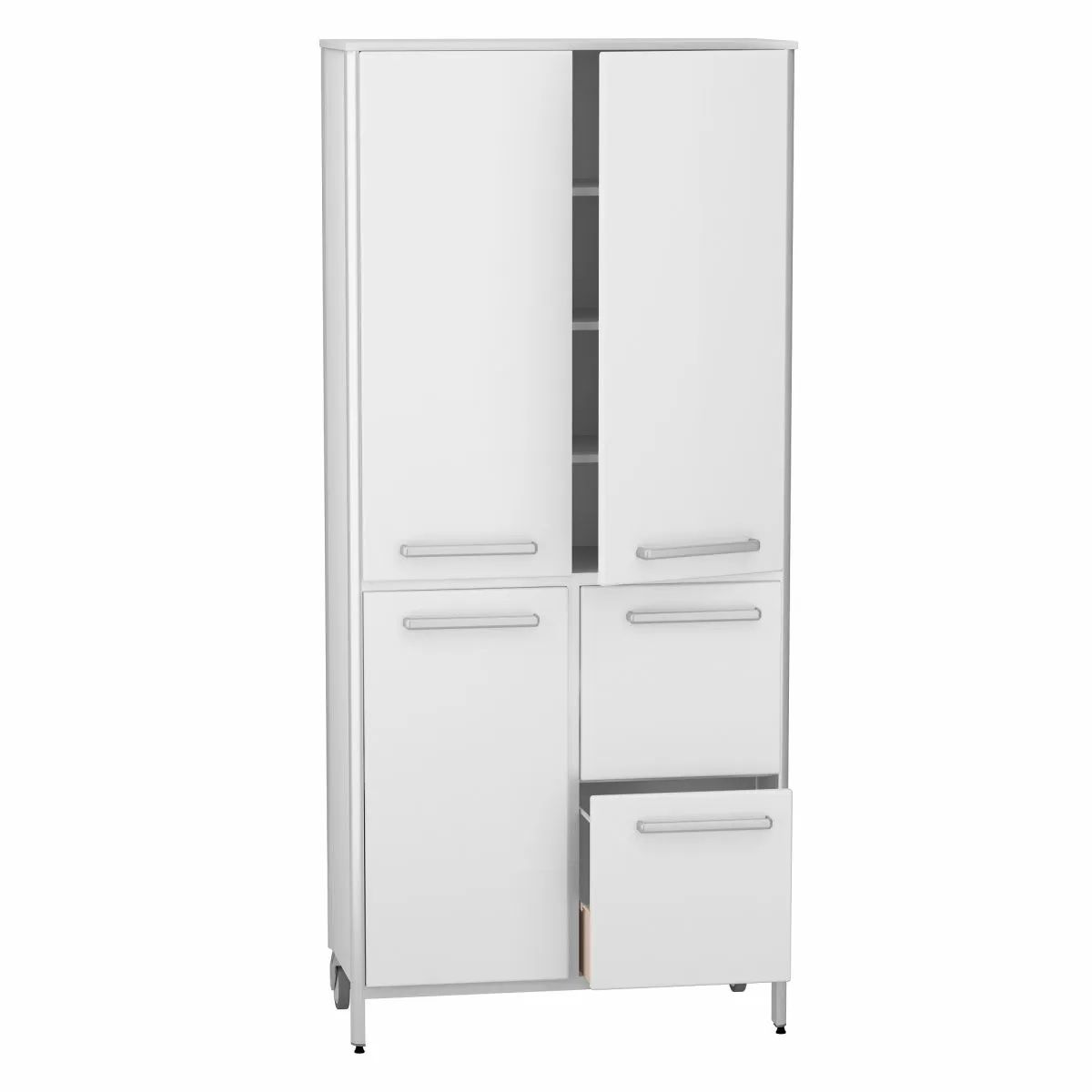 Двери установлены на петли с доводчиком — они открываются и закрываются ровно, без резких хлопков. На дверцах и ящиках предусмотрены горизонтальные алюминиевые ручки длиной 256 мм: за них удобно браться в перчатках, а сама форма смотрится аккуратно и «по-медицински».