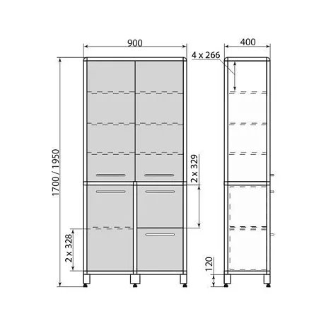 Практичный формат 900×400 мм помогает рационально использовать площадь кабинета: шкаф достаточно вместительный по высоте и секциям, но не «съедает» проходы и не мешает расстановке оборудования.