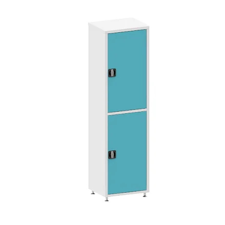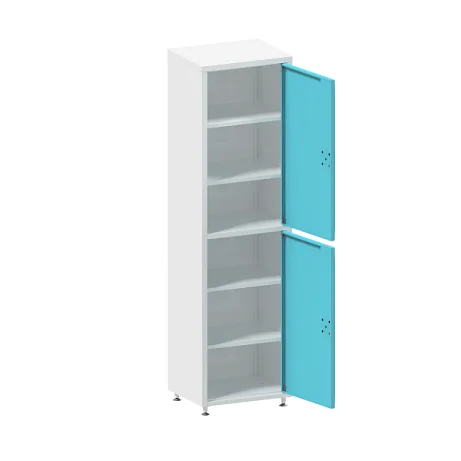Изготовлен из металла толщиной не менее 0,8 мм. Окрашен порошковой краской белого цвета. Каждой из секций (верхней и нижней) по 2 полки из металла. 2 дверцы из металла, каждая из которых оснащена ригельным замком. Дверцы можно установить, как на левую сторону, так и на правую, путем перестановки втулок для петель. Шкаф установлен на регулируемые по высоте опоры. Расстояние между полками регулируется по высоте, путем установки полкодержателей в заготовленные для них отверстия.