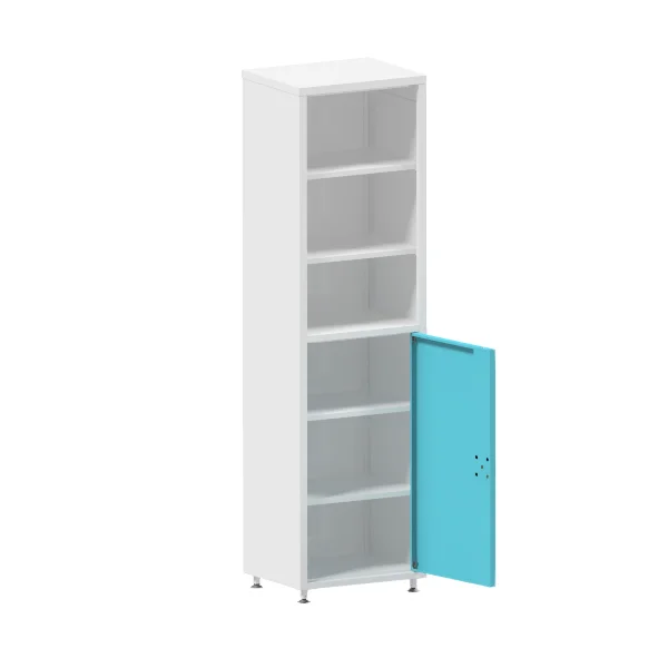 Изготовлен из металла толщиной не менее 0,8 мм. Окрашен порошковой краской белого цвета. Верхняя секция выполнена в виде открытого стеллажа без дверцы, с 2 полками из металла. Нижняя секция с двумя полками из металла и дверцей из металла с ригельным замком. Дверцу можно установить, как на левую сторону, так и на правую, путем перестановки втулок для петель. Установлен на регулируемые по высоте опоры. Расстояние между полками регулируется по высоте, путем установки полкодержателей в заготовленные для них отверстия.