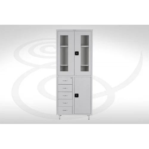 Шкаф медицинский МЕХа.02, разработан для хранения карточек пациентов, документов и прочих данных на бумажных носителях. Данная модель состоит из нескольких секций и оснащена центральным замком, на который запираются ящики. Отдельными ригельными замками оборудована глухая дверь нижнего отделения и застекленная секция. За застекленными дверьми есть стальные полки с полимерно-порошковым покрытием. Левая нижняя часть оснащена пятью бесшумно выдвигающимися ящиками на телескопических направляющих. Часть справа запирается глухой распашной дверцей на съемных пружинных петлях. Конструкция надежно стоит благодаря небольшим прорезиненным ножкам. Модель полностью покрыта импортным полимерно-порошковым составом, устойчивым к механическим воздействиям.