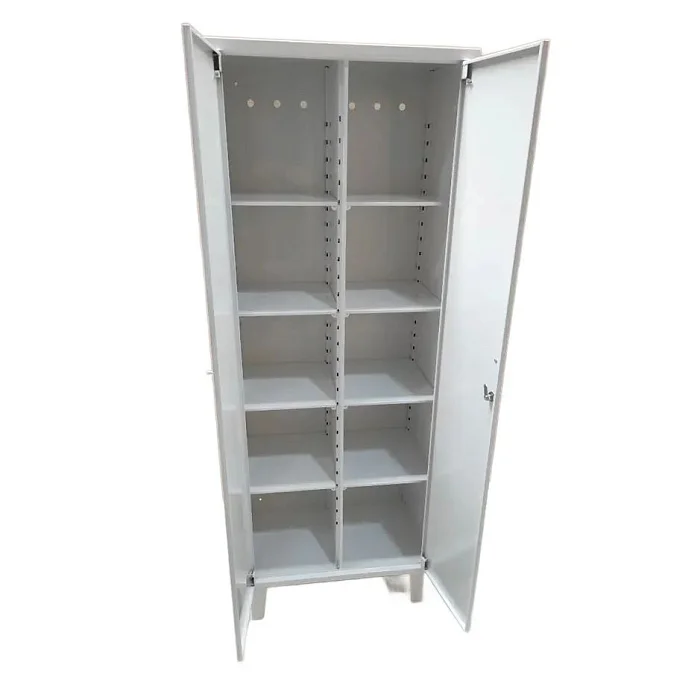 В каждом отделении предусмотрено по четыре съемные полки с регулировкой по высоте; при необходимости вместо полок можно установить перекладину для вешалок. Полки крепятся на четыре кронштейна, а допустимая равномерно распределенная нагрузка на каждую полку и дно шкафа составляет до 10 кг. Металлические двери закрываются на замок, в комплекте идут два ключа, для комфортного открывания установлены ручки-кнопки.