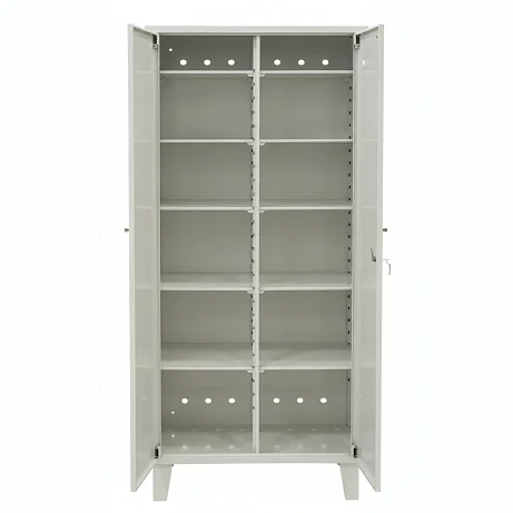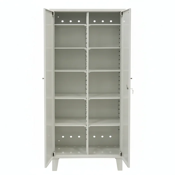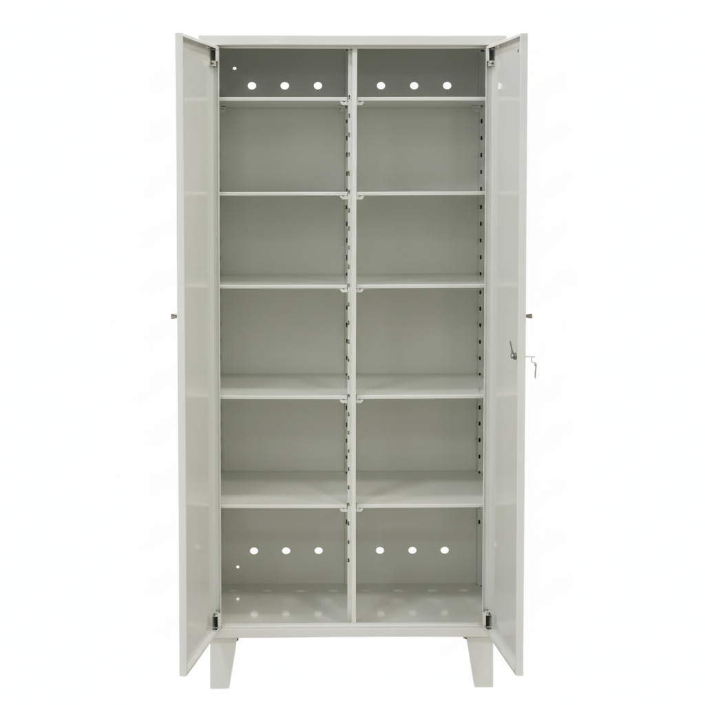 Шкаф двухдверный, с двумя отделениями по горизонтали. В каждом отделении предусмотрено по пять съёмных полок. Полки можно переставлять по высоте под конкретные коробки и контейнеры — от небольших упаковок до более габаритных расходников. Каждая полка устанавливается на четыре кронштейна, что помогает распределять нагрузку и сохранять стабильность при регулярном использовании.