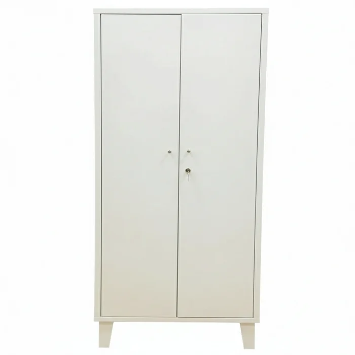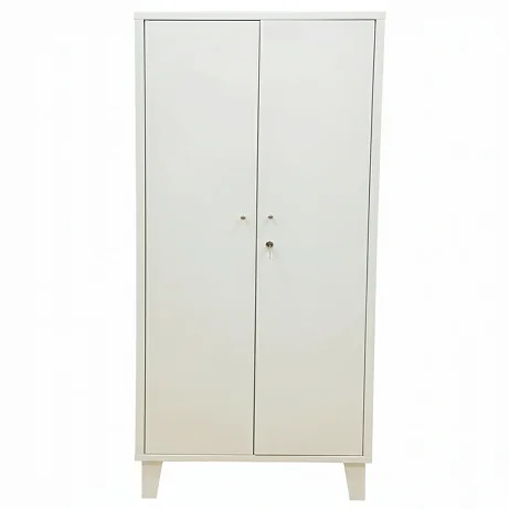 Металлические двери закрываются на замок, в комплекте идут два ключа. Для повседневного удобства на дверях установлены ручки-кнопки. Шкаф стоит на конических ножках: передние оснащены регулируемыми по высоте опорами, чтобы компенсировать неровности пола и надежно выставить шкаф по месту, задние ножки — без регулировки.