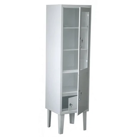 Шкаф Медицинский ШМ 1-2 ВТ, используется для хранения сильнодействующих препаратов в условиях операционных, смотровых и перевязочных кабинетов клиник и больниц, а также других учреждений системы здравоохранения. Сварной корпус шкафа выполнен из достаточно плотной листовой стали, также все металлические поверхности покрыты полимерно-порошковым составом. Шкаф разделен на две части: верхние двери оснащены стеклянной вставкой, нижние — глухие. Двери оборудованы ручками-кнопками и отдельными замками, а также имеют дополнительную защиту от взлома, благодаря внутренним петлям. В верхней части есть две металлические полки, а в нижней – встроенный трейзер (сейф). Есть четыре опоры (ножки), две из них регулируемые, конусовидной формы из стального уголка.