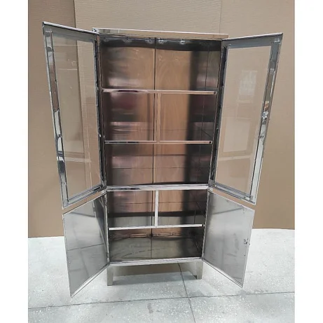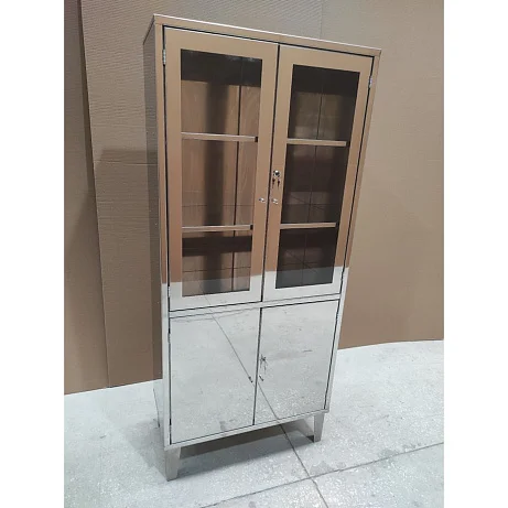 Шкаф изготовлен из листовой нержавеющей стали AISI 304 толщиной 1,0 мм — это практичный выбор для медицинской мебели: материал устойчив к коррозии, спокойно переносит регулярную влажную уборку и контакт с распространенными дезинфицирующими растворами. Поверхности проще поддерживать в чистоте, а аккуратный внешний вид сохраняется дольше даже при интенсивной эксплуатации.