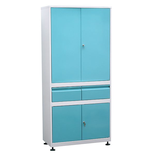 Привлекательный и необычный шкаф медицинский ШММ-2-Р-2-Ц выглядит менее строго и скучно, чем простой белый благодаря окрашенным в красивый цвет лицевым поверхностям дверок и выдвижных ящиков. В верхнем отделении дополнительно установлены три полочки. В средней части шкафа расположены два выдвижных ящика на телескопических направляющих — каждый под отдельной створкой двери верхней части. В нижней части одно общее отделение. Две двухстворчатые дверцы шкафа запираются.