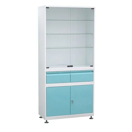 Удобной и привлекательной моделью мебели для обустройства рабочего места сотрудника медучреждения станет шкаф медицинский ШМС-2-Р-2-Ц. Его конструкция очень функциональна и позволяет разделить на категории и хранить их отдельно друг от друга различные необходимые вещи: лекарства, документы и инструменты. Верхнее отделение разделено на секции тремя полочками из стекла, эта часть закрывается двустворчатой стеклянной дверью. Среднее отделение — это два выдвижных ящика. Нижнее закрывается металлической дверцей, которая запирается. Здесь общее отделение. Металлические дверцы и лицевая поверхность выдвижных ящиков окрашены в привлекательный оттенок.