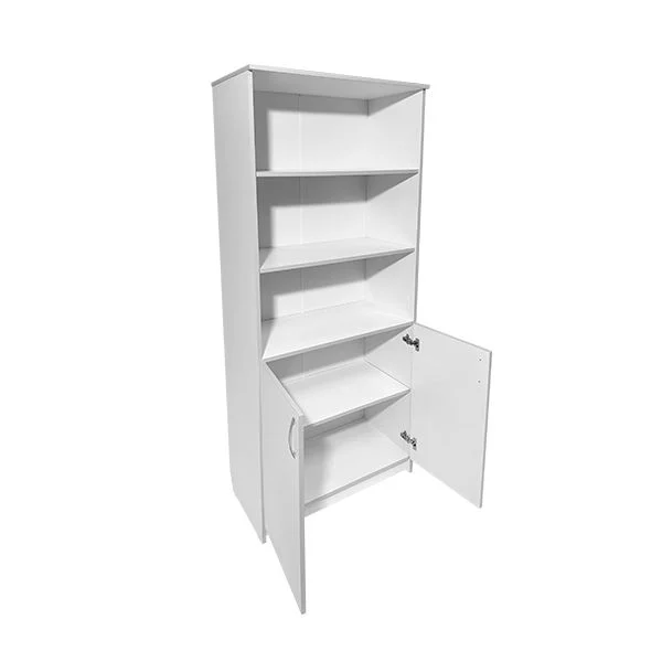 Верхняя часть — это зона оперативного доступа. Две открытые полки идеально рассчитаны под стандартные папки-регистраторы формата А4 (типа «Корона»). Здесь удобно держать текущую документацию, справочники, бланки рецептов или коробки с перчатками, которые должны быть под рукой ежеминутно. Отсутствие дверей экономит секунды при каждом обращении и пространство — вам не нужно место для распахивания створок на уровне глаз.