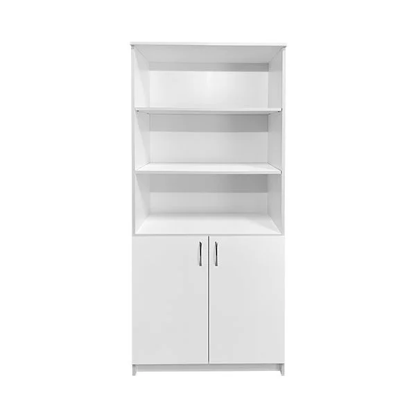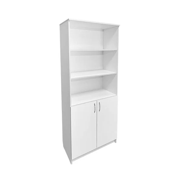 Корпус изделия выполнен из качественного ЛДСП толщиной 16 мм, что гарантирует долгий срок службы мебели. Функционально шкаф разделен на две зоны: верхний открытый отсек с двумя полками обеспечивает быстрый доступ к часто используемым бумагам, а нижнее отделение, закрывающееся на две глухие дверцы, позволяет хранить архивные документы или инвентарь на внутренней полке.