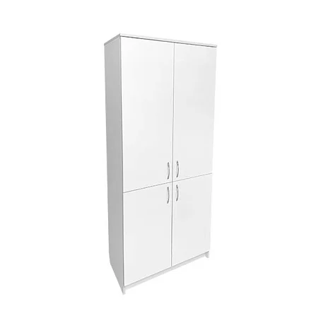Корпус изделия выполнен из надежного ЛДСП толщиной 16 мм и установлен на пластиковые подпятники с цоколем, что обеспечивает устойчивость и долговечность конструкции. Шкаф состоит из двух функциональных секций с распашными дверцами: верхнее отделение оснащено двумя полками для удобного доступа к бумагам, а нижнее располагает одной вместительной полкой.