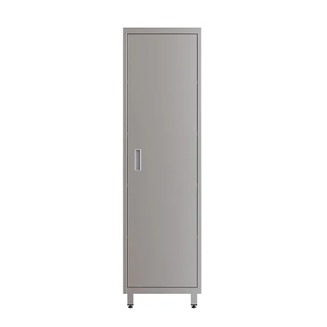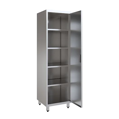 Корпус шкафа выполнен в виде прочной сварной конструкции из нержавеющей стали AISI 304 (возможно изготовление из стали AISI 430). Модель оснащена одной распашной дверью, обеспечивающей удобный доступ к содержимому при ежедневной эксплуатации. Внутри шкафа четыре удобные полки.