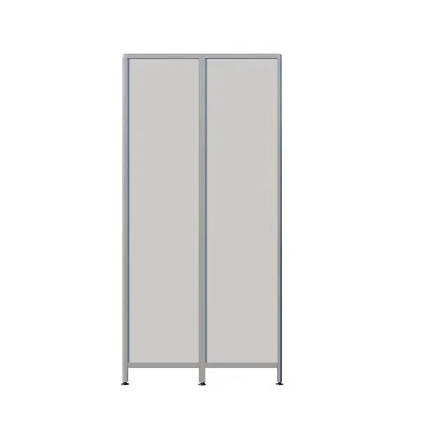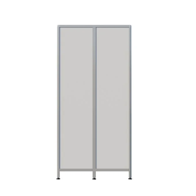 Шкаф имеет регулируемые ножки, что обеспечивает стабильность при установке на неровные поверхности, а покрытый порошковой краской алюминиевый профиль каркаса защищен от коррозии и внешних воздействий. Декорированный профиль на углах придает шкафу изысканный вид, а разделенная на отделения ниша облегчает организацию и размещение вещей.
