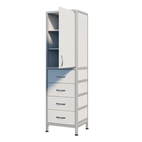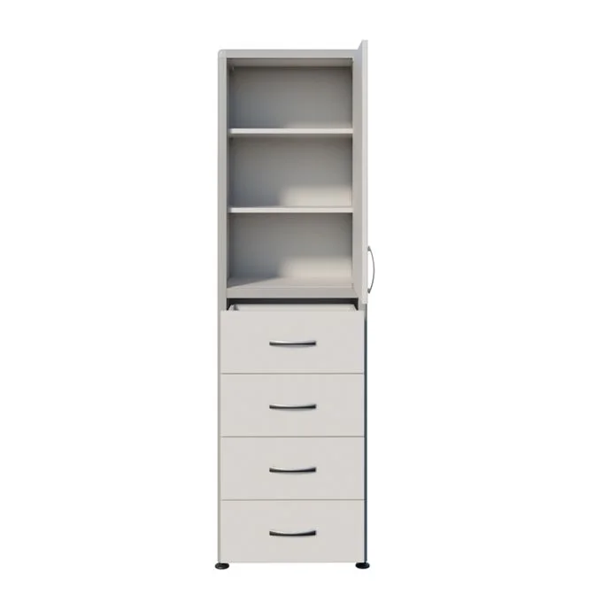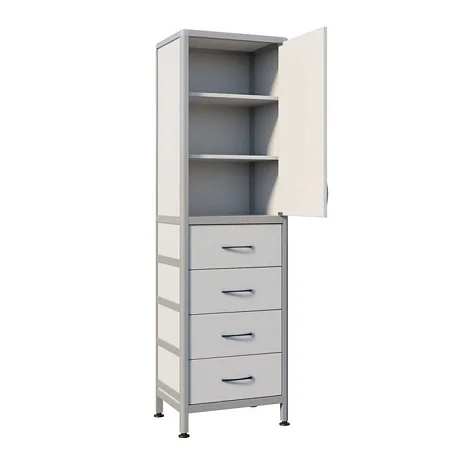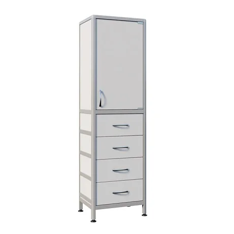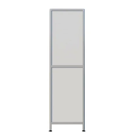 СТР МД-ал 111.05 оснащен полками, дверцей, а также выдвижными ящиками в нижнем отделе для удобного размещения и хранения различных предметов. Каркас из алюминиевого профиля обеспечивает жесткость, устойчивость и прочность шкафа, что делает его долговечным и надежным элементом обстановки. Высота ножек регулируется с помощью винтовых опор, что позволяет устанавливать шкаф на неровных поверхностях без ущерба для его стабильности.