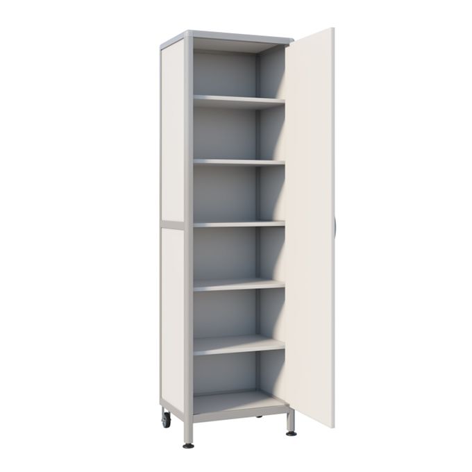 Внутреннее пространство разделено на пять полок с равномерным шагом около 268 мм. Это комфортное расстояние для аккуратной расстановки контейнеров, коробок с перевязочными средствами, упаковок перчаток, дезинфицирующих средств, лабораторных расходников и других позиций, которые должны быть защищены от пыли, но всегда доступны персоналу.