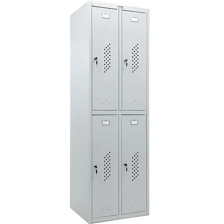 Шкаф ПРАКТИК LS-22 разделен на 4 отделения, каждое закрывается на свой замок. Такие конструкции можно скреплять между собой, чтобы создать единый комплекс шкафчиков в раздевалке или камерах хранения. Дверца каждого шкафчика закрывается на замок. Возможна установка различных систем запирания — стандартного или навесного ключевого замка или такого, который будет открываться монетой или жетоном. Внутренне пространство шкафчиков хорошо проветривается через вентиляционные отверстия.