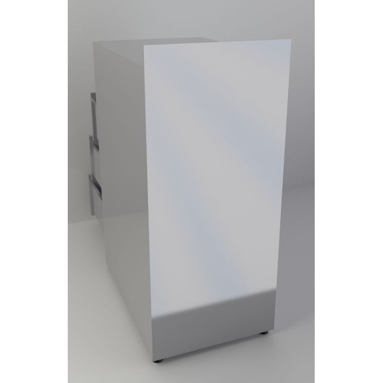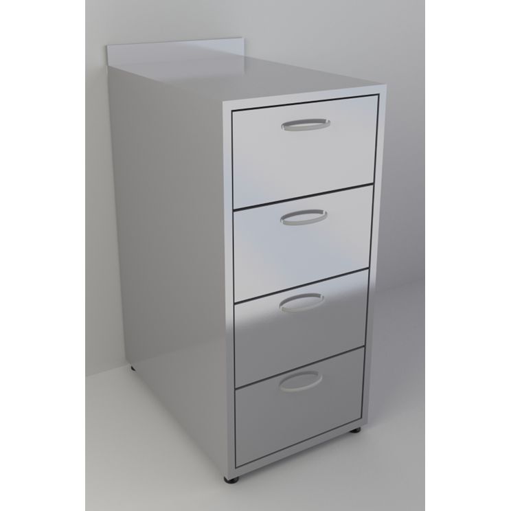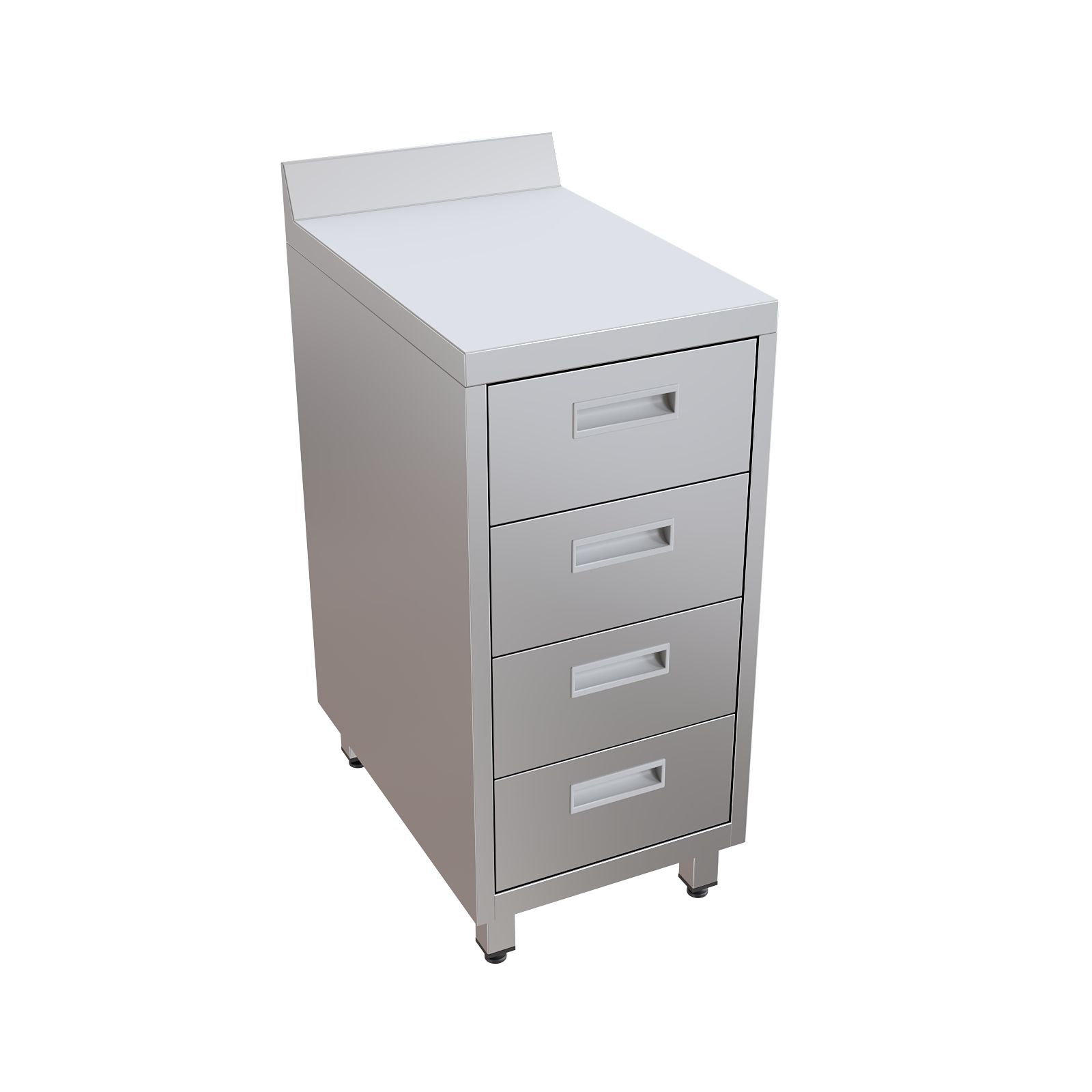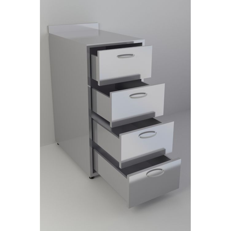 Прочный шкаф-тумба в форме сварной конструкции из нержавеющей стали AISI 304 (с опцией из AISI 430) идеально подойдет для размещения в лабораториях, процедурных кабинетах, стоматологических или офтальмологических отделениях, профессиональной кухне или производстве. Установлен на четырех регулируемых по высоте опорах для удобства. Оснащен четырьмя выдвижными ящиками и столешницей с бортом для максимальной практичности и гигиены.