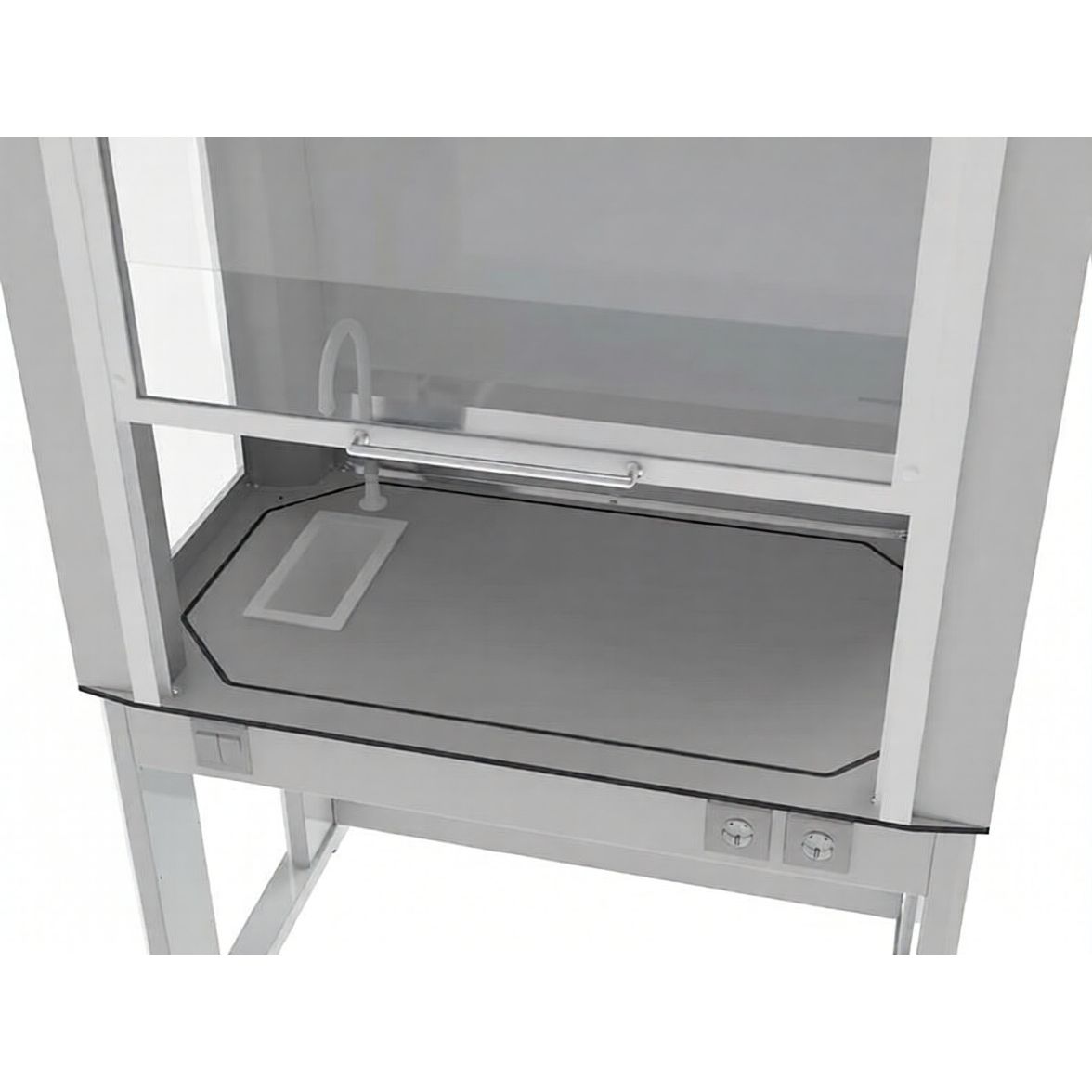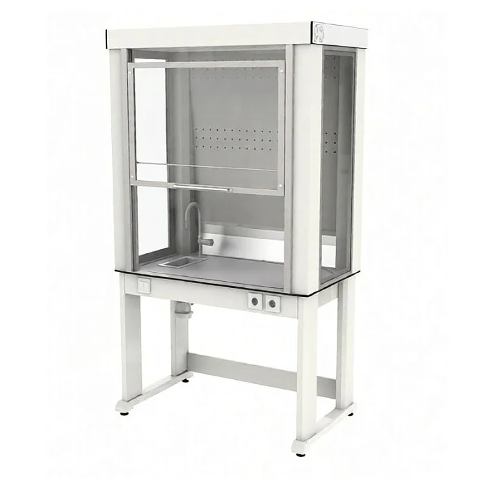 Ключевой плюс для рутины: встроенная мойка с смесителем прямо в рабочей зоне экономит время и снижает риск переноса загрязнений по лаборатории — промывка, нейтрализация и подготовка посуды выполняются на месте.
