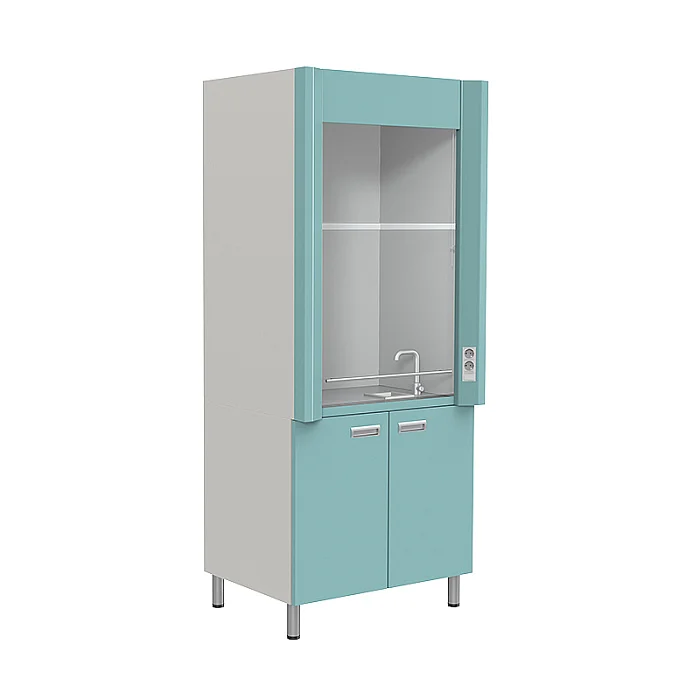 В комплектацию шкафа входит полипропиленовая раковина размером 300х300х150 мм и кран для подачи воды, что делает его особенно функциональным в условиях лаборатории. Подъемный экран из ударопрочного стекла толщиной не менее 5 мм, дополненный пластиковыми направляющими, снижает уровень шума и предотвращает возможные сколы, обеспечивая тем самым долговечность и безопасность эксплуатации.
