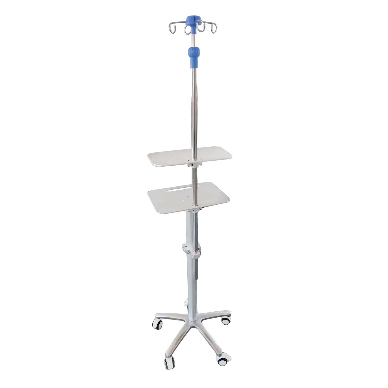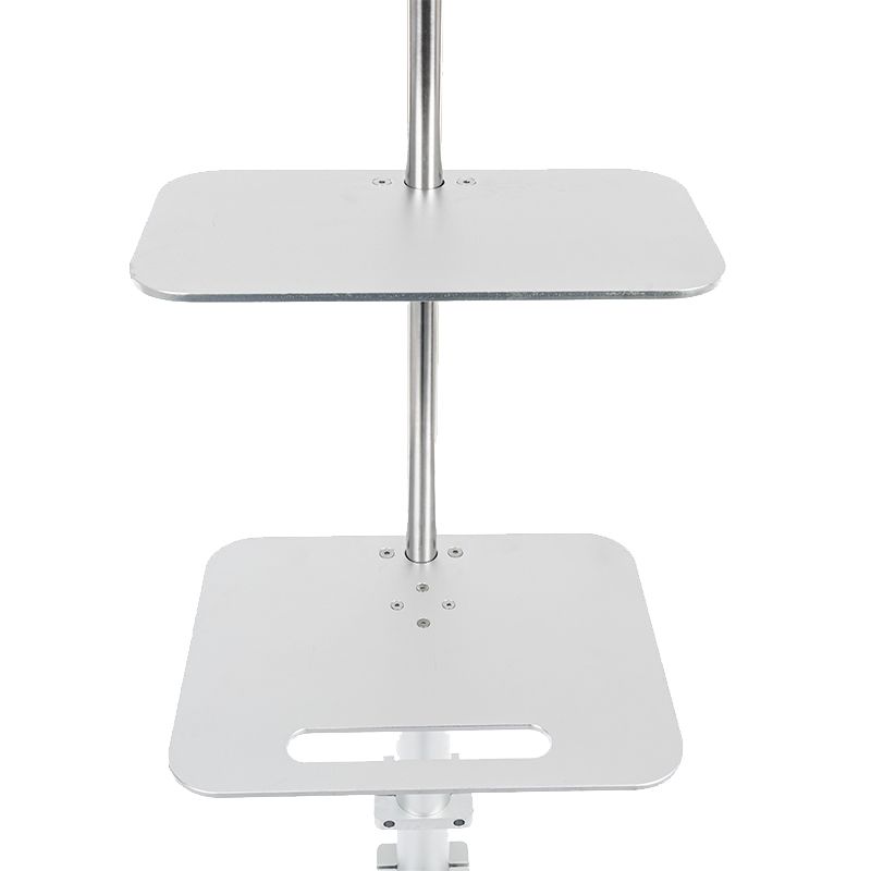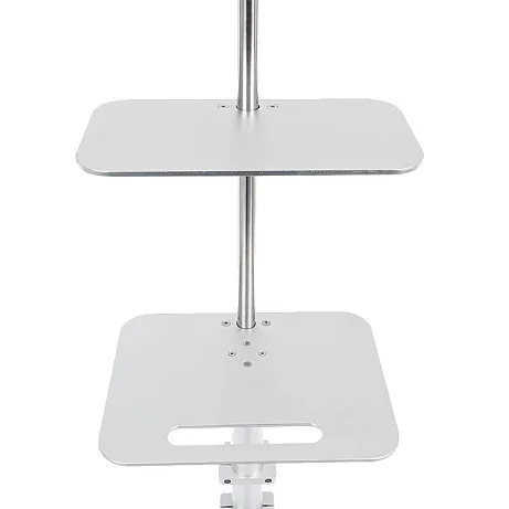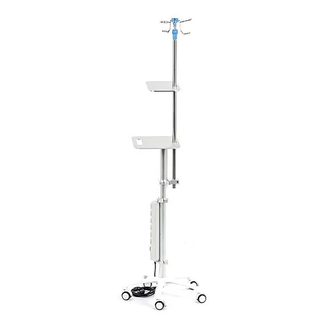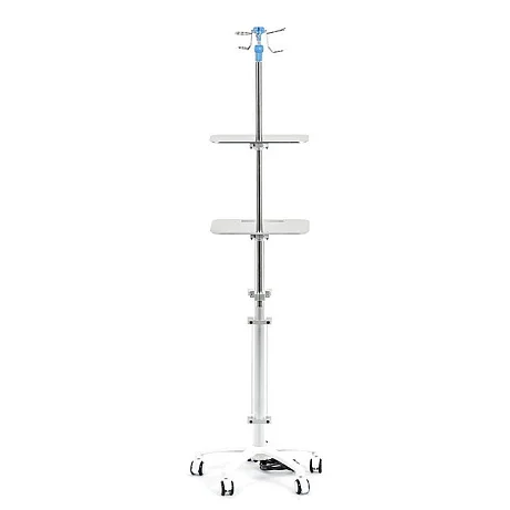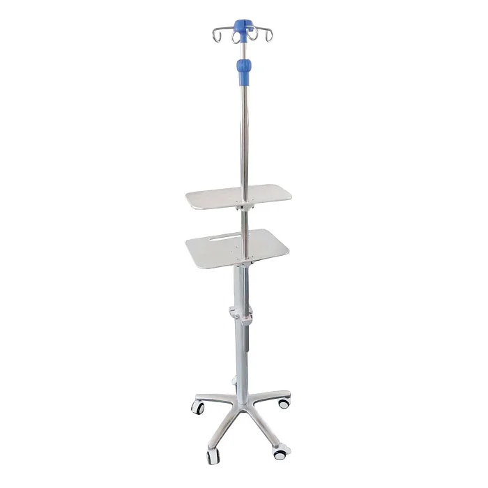 Две полки позволяют развести по уровням оборудование — например, шприцевые насосы ниже, монитор слежения выше (или наоборот — в зависимости от сценария и роста персонала). В результате экран остаётся в зоне видимости, а доступ к насосам — быстрым и безопасным.