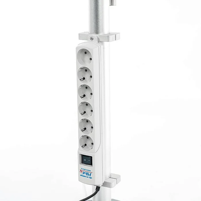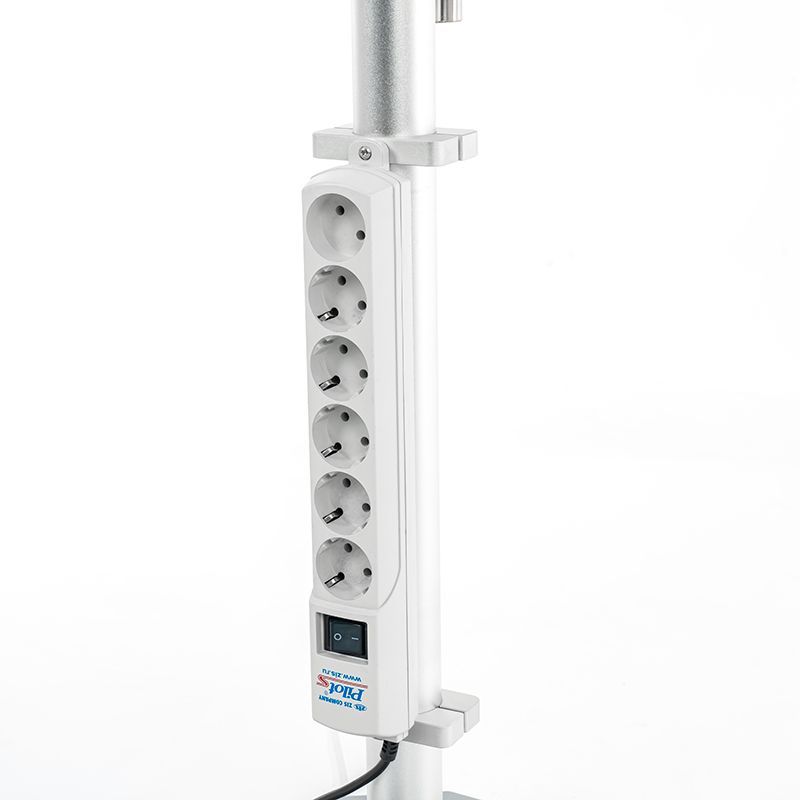 Высота регулируется в диапазоне 1600–2200 мм. Механизм — зажимной винт: понятное и надёжное решение, которое не требует привыкания и позволяет быстро выставить нужный уровень. Это особенно полезно при перестановке стойки между зонами, разной высоте кроватей, а также при изменении количества подключённых линий и расположения монитора.