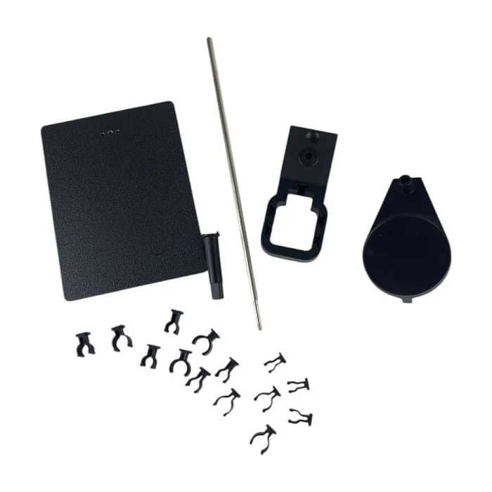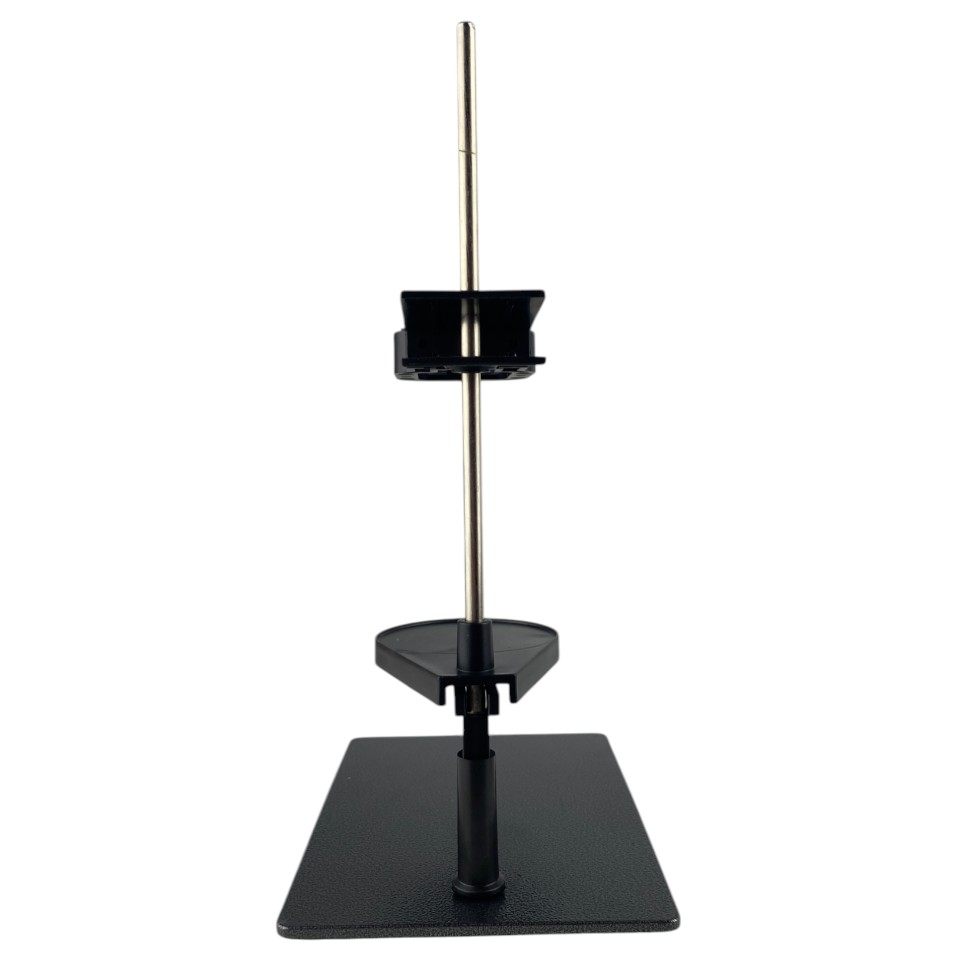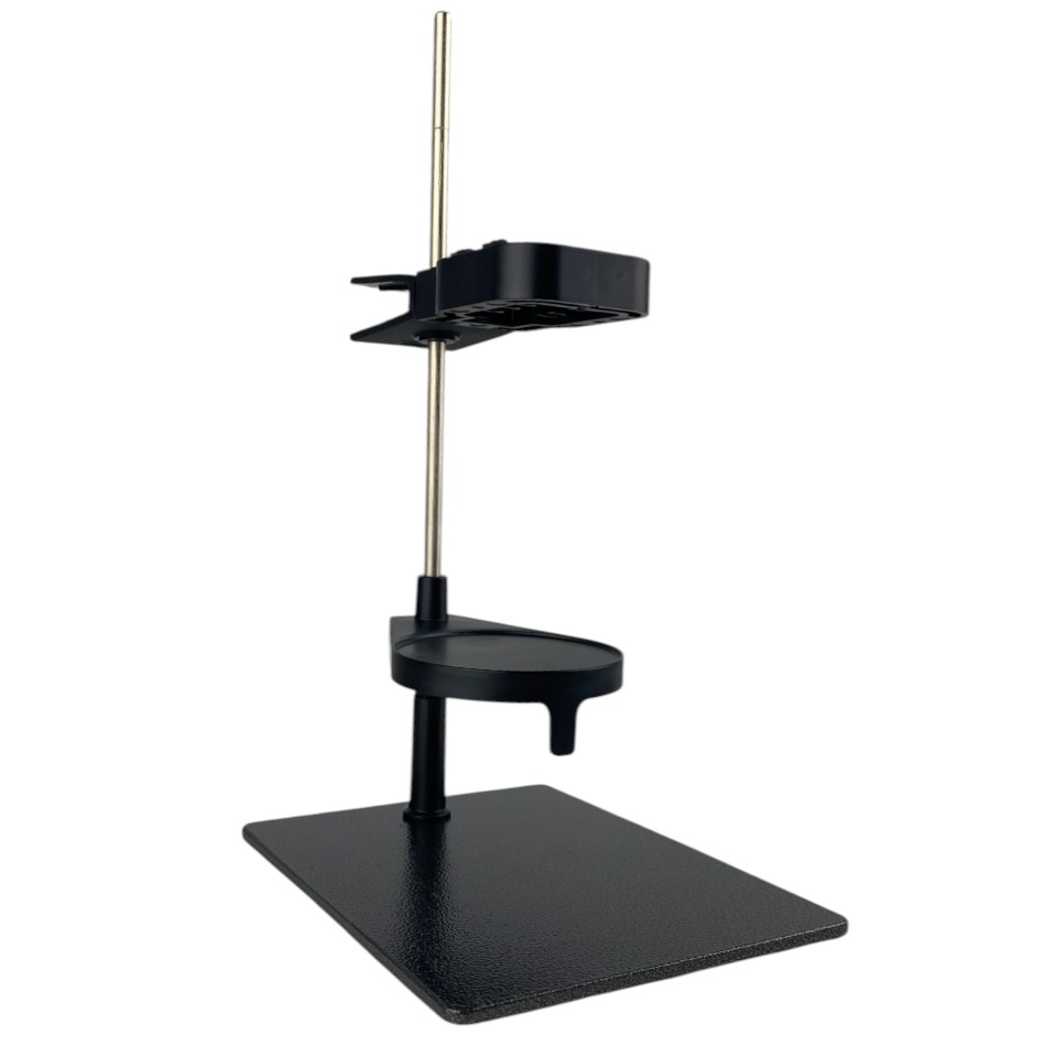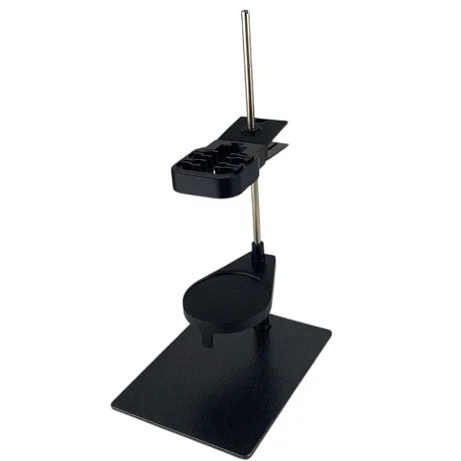 Основание и стойка выполнены из стали — это дает необходимую жесткость и устойчивость на столе. Держатели изготовлены из пластика: такой материал бережно относится к корпусу электродов и не требует сложного ухода. Разборное исполнение удобно при транспортировке, хранении и обслуживании: штатив можно быстро собрать и подготовить к работе без специальных инструментов и «танцев» с крепежом.