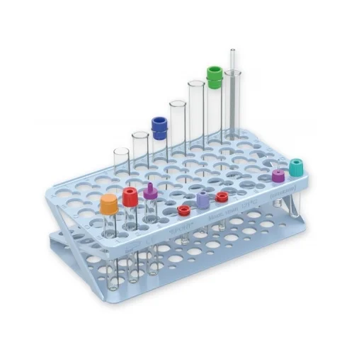 Штатив для пробирок универсальный ШПУ-«КРОНТ» может использоваться как самостоятельной изделие, так и для размещения пробирок с целью их дальнейшей транспортировки в изделии «Укладка-контейнер полимерный для доставки проб биологического материала в пробирках и флаконах УКП-01-«КРОНТ» производства АО «КРОНТ-М». Универсальный штатив для пробирок вмещает до 100 емкостей различного диаметра, от вакутайнеров до пробирок вместимостью 20 мл. Применим для конических, цилиндрических и микропробирок. Для удобства хранения проб на штатив по периметру нанесена буквенная и цифровая маркировка (1-10; А-Е). Материал изделия – ударопрочный пластик, устойчивый к химическим реагентам.