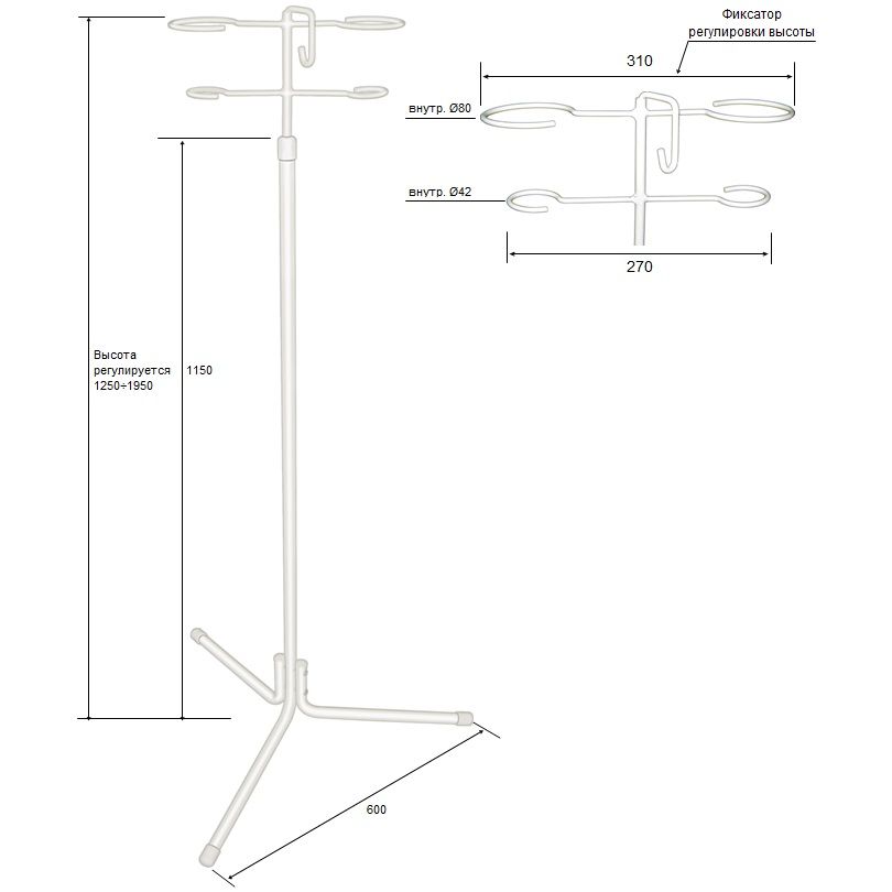 Штатив для вливаний Техсервис М192-03 с двумя держателями и дополнительным крючком-держателем обеспечивает крепление инфузионных пакетов и флаконов с лекарственными препаратами при проведении инфузионной терапии