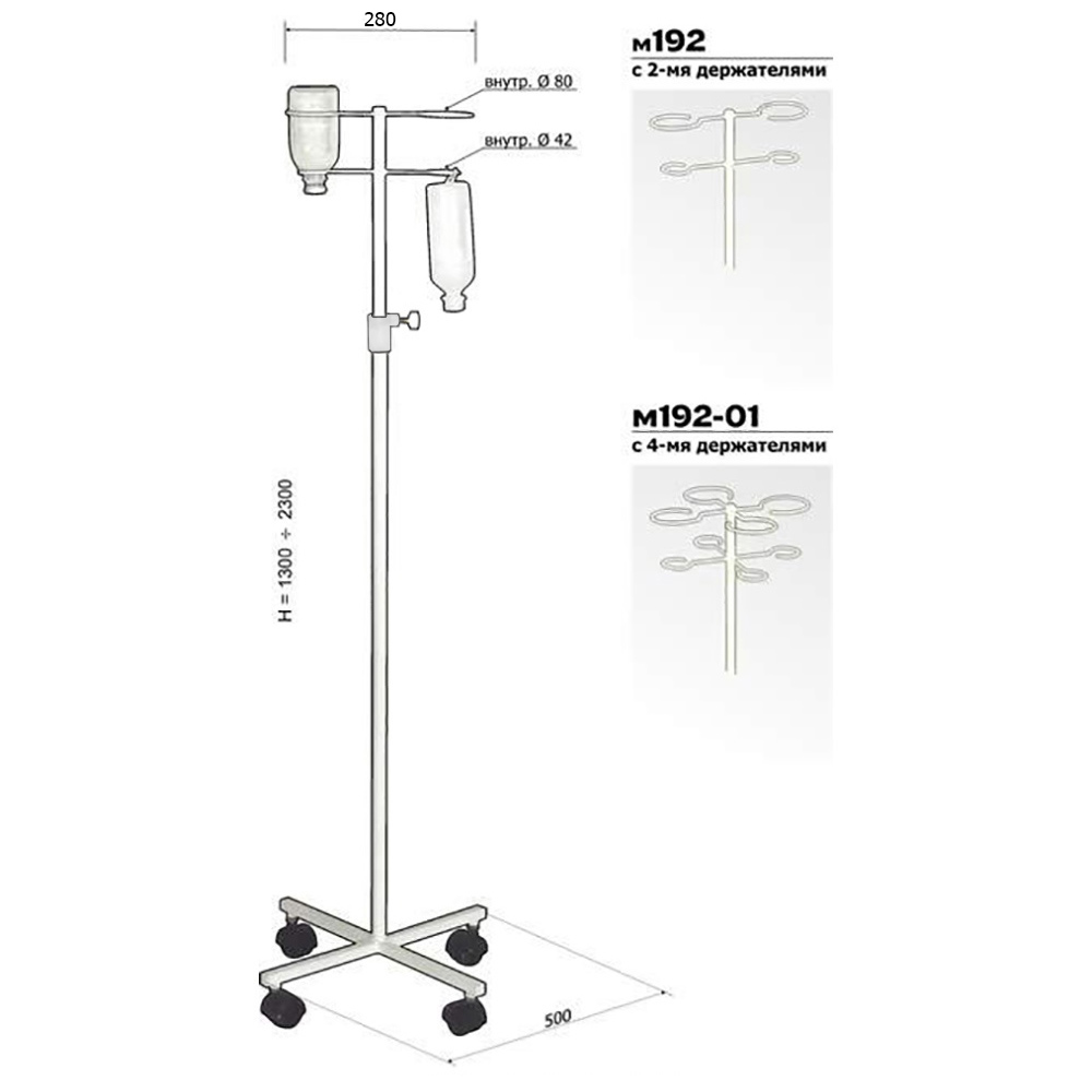 Штатив для вливаний Техсервис М192 с двумя держателями на 4-опорной передвижной стойке предназначен для крепления инфузионных пакетов и флаконов с лекарственными препаратами при проведении инфузионной терапии