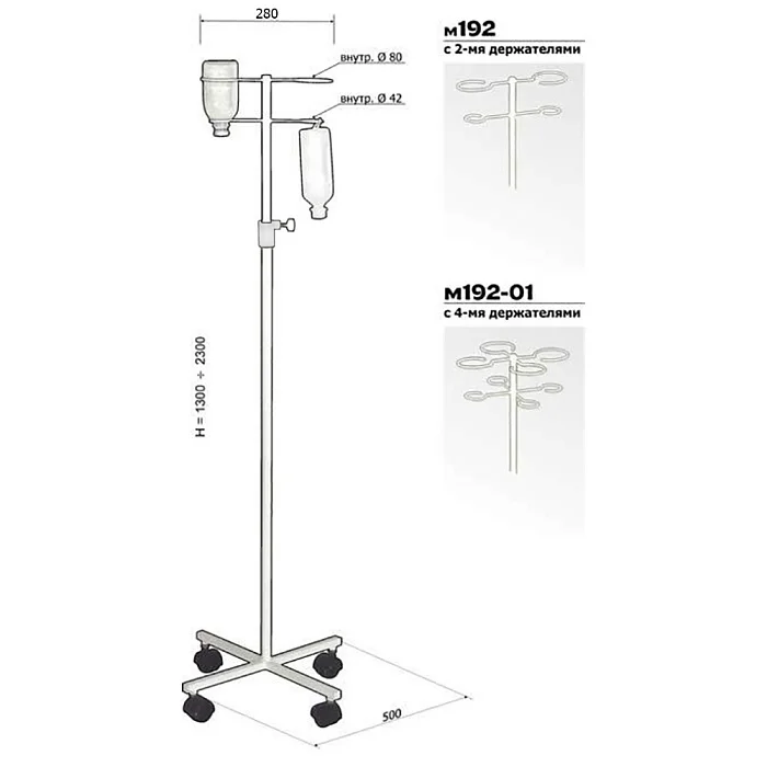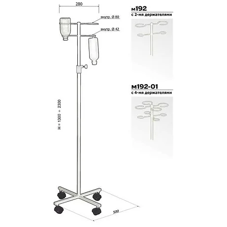 Штатив для вливаний М192 с 2-мя держателями предназначен для проведения процедур вливания в стационарах медучреждений. Стойка изготовлена из стали и окрашена порошковой краской. Штатив оснащен двумя держателями. Высота стойки может регулироваться в диапазоне от 1300 мм до 2300 мм. Устойчивость штативу обеспечивает четырехпалое основание. Стойка может легко передвигаться за счет установленных на ножках роликов. Только в интернет-магазине «МедМебель» вы можете приобрести штатив для вливаний М192 по самой доступной цене. Мы работаем напрямую с производителями медицинской мебели. В пределах Москвы доступна услуга адресной доставки заказов. По России товары отправляем транспортными компаниями.
