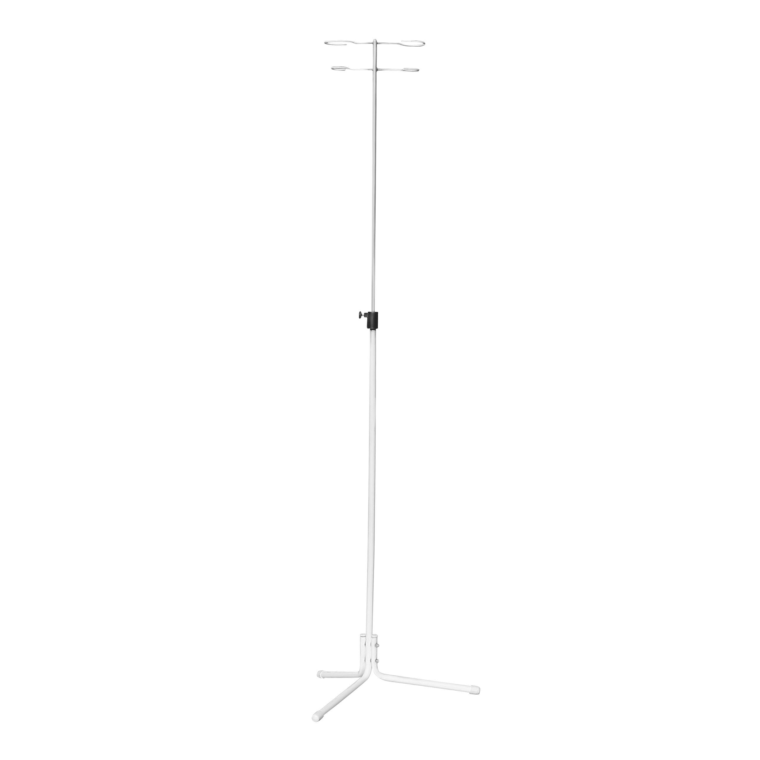 Штатив выполнен на металлической стойке с телескопической верхней частью. Регулировка высоты в диапазоне от 1250 до 1950 мм позволяет выставить емкость на нужном уровне — под рост пациента, высоту кушетки или кровати, а также особенности конкретной процедуры.