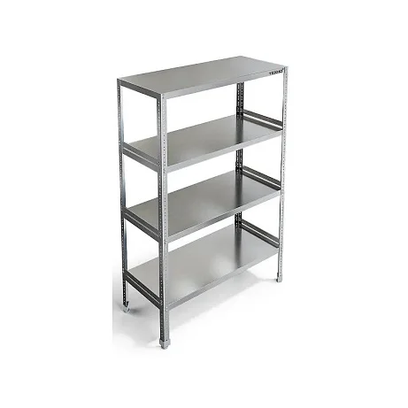 Простой и надёжный стеллаж для кухни: четыре стойки из нержавейки 2 мм и четыре цельные полки 0,8 мм из нержавейки AISI 304, которые можно закрепить на любой удобной высоте. Ножки с регуляторами позволяют выровнять стеллаж на неровном полу, исключают раскачивание и повышают устойчивость.