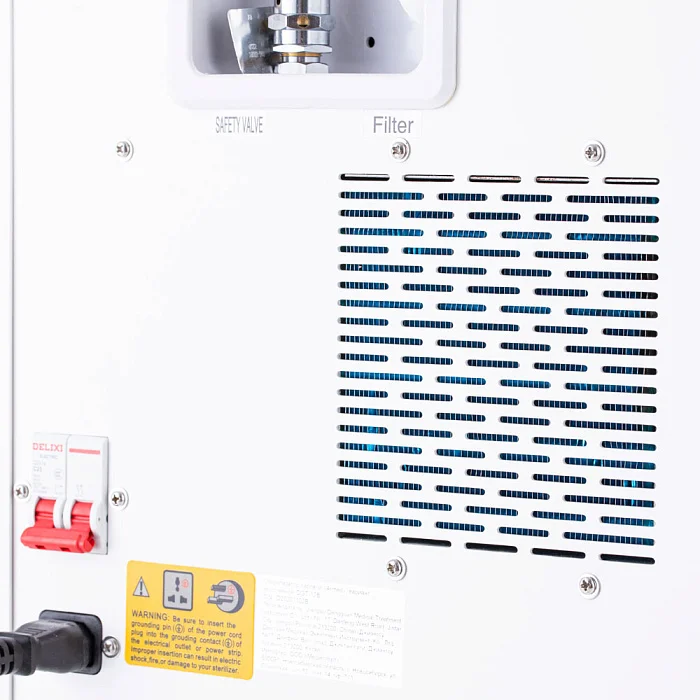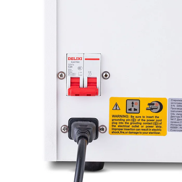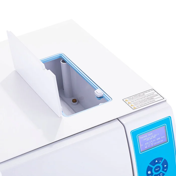 На лицевой панели расположены кнопки управления и LCD-дисплей с разрешением 128x64, на котором отображаются данные по процессу стерилизации, подключению термопринтера и температура, давление в помещении