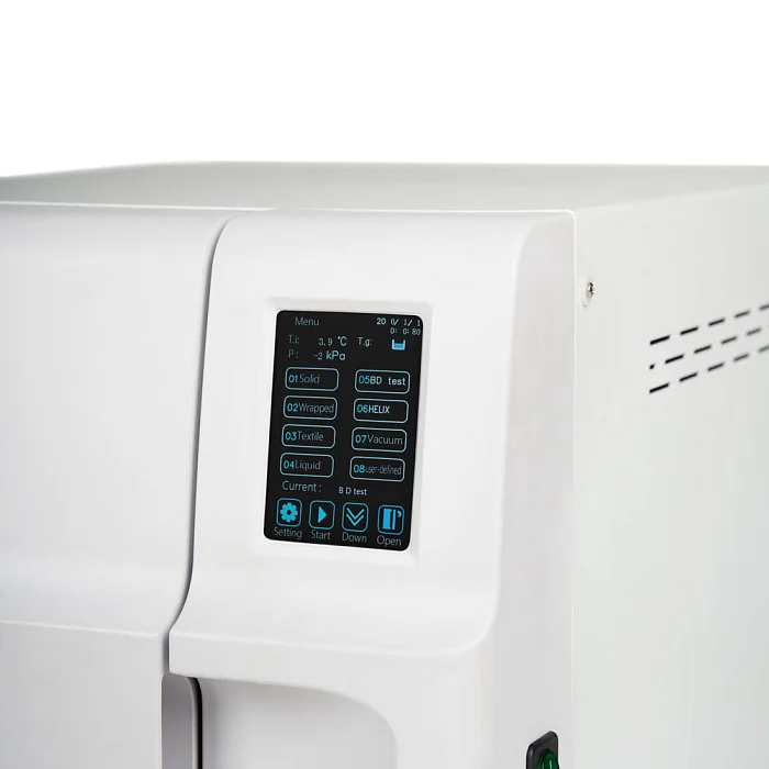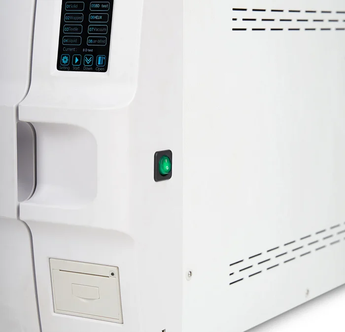 На лицевой панели расположен сенсорный LCD-дисплей с разрешением 800x480, на котором отображаются данные по процессу стерилизации, работе термопринтера и температура, давление в помещении