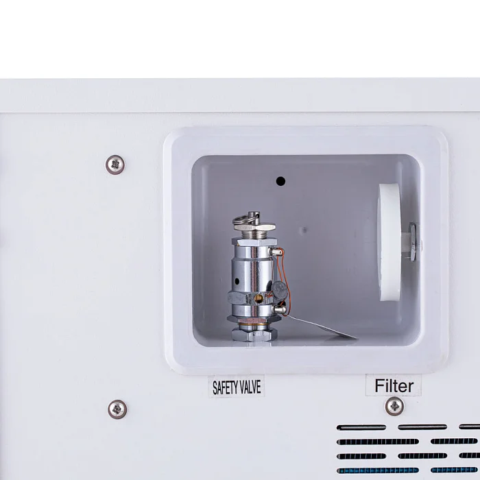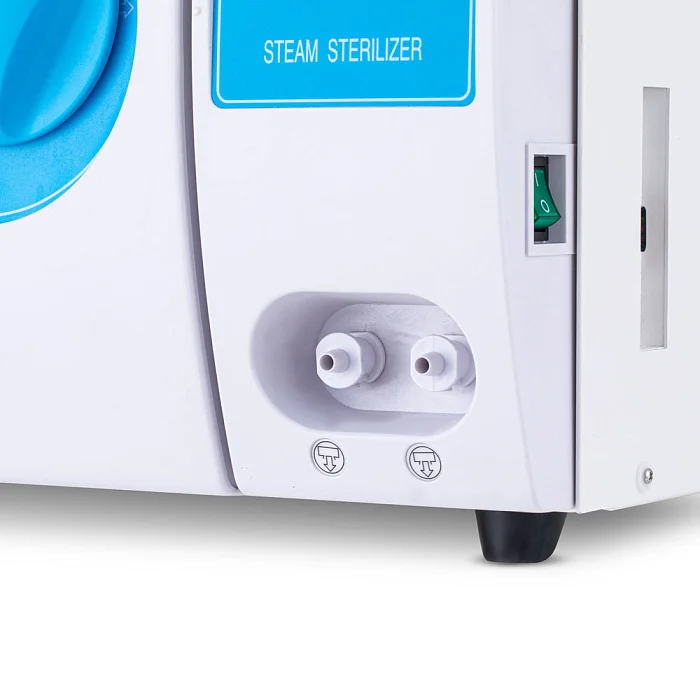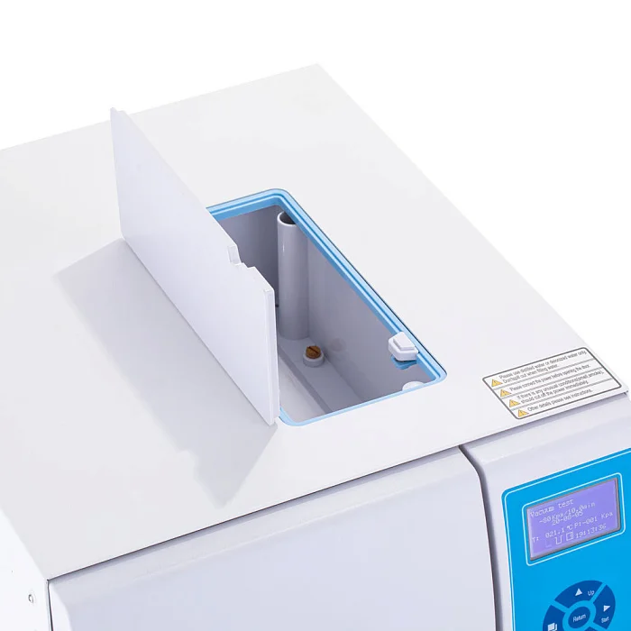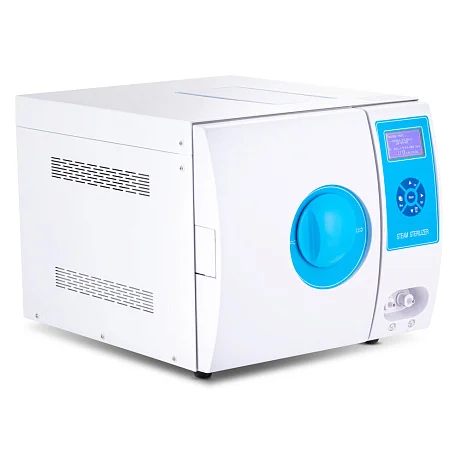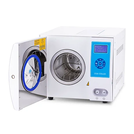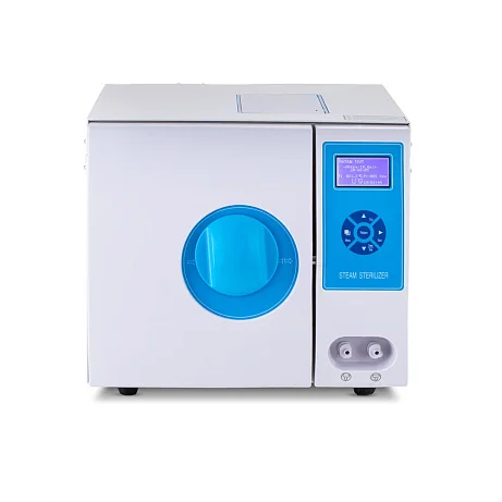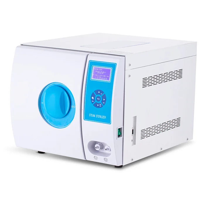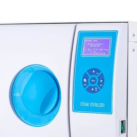 На лицевой панели расположены кнопки управления и LCD-дисплей с разрешением 128x64, на котором отображаются данные по процессу стерилизации, подключению термопринтера и температура, давление в помещении