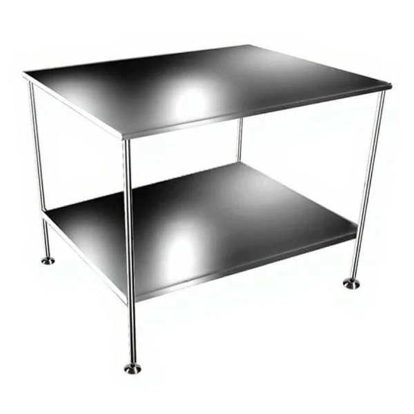 Стол выполнен на сварном каркасе — это дает стабильность, предсказуемую геометрию и отсутствие «люфтов», которые нередко появляются у мебели с разборными узлами при активной эксплуатации. Столешница и нижняя полка изготовлены из нержавеющей стали толщиной 0,8 мм, имеют загнутые вниз края и крепятся к прямоугольной раме каркаса через отверстия в этих краях. Такое решение повышает жесткость и делает конструкцию более собранной.