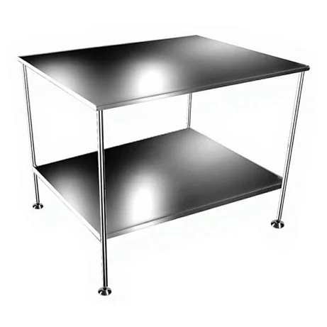 Основа стола — сварной каркас с прямоугольной рамой. Столешница и полка крепятся через отверстия в загнутых кромках, что помогает сохранять геометрию и аккуратность соединений при эксплуатации. Для повышения надежности обе поверхности усилены ребрами жесткости.