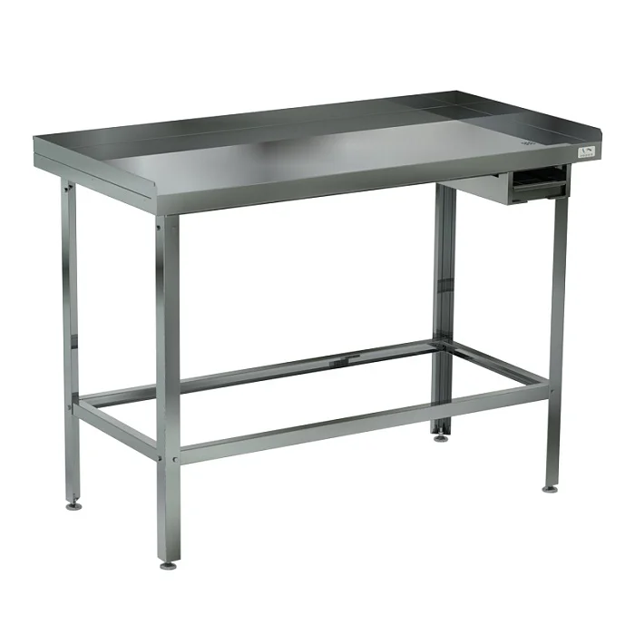 Стол для мяса СМ-120/80 с достаточно глубокой столешницей обеспечивает просторную рабочую поверхность. С трех сторон на столешнице установлены бортики, благодаря которым брызги со стола во время работы не загрязняют окружающие поверхности. Для наибольшего удобства во время работы в столе сделана емкость для сбора отходов и жидкости, которая стекает в нее через специальное отверстие в столешнице. Для изготовления стола использована нержавеющая сталь, поэтому он долговечен и практичен. Между ножками конструкции сделана обвязка, поэтому стол устойчив. Покупайте стол прямо сейчас, ведь в нашем магазине вам обеспечены самые выгодные цены и условия доставки по Москве и в другие населенные пункты. Возможно изготовление мебели из нержавеющей стали по Вашим чертежам и размерам. Для просчета возможности изготовления изделия, не представленного на сайте, и получения коммерческого предложения, просим обращаться к менеджерам компании по телефону или электронной почте.