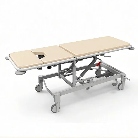 Высота ложа регулируется гидроприводом с ножными педалями, расположенными по обеим сторонам — персоналу не нужно обходить стол, чтобы поднять или опустить пациента. Наклоны спинной и тазовой секций выполняются с помощью пневмопружин: движение плавное, фиксация надежная, а сам процесс не требует значительных усилий.
