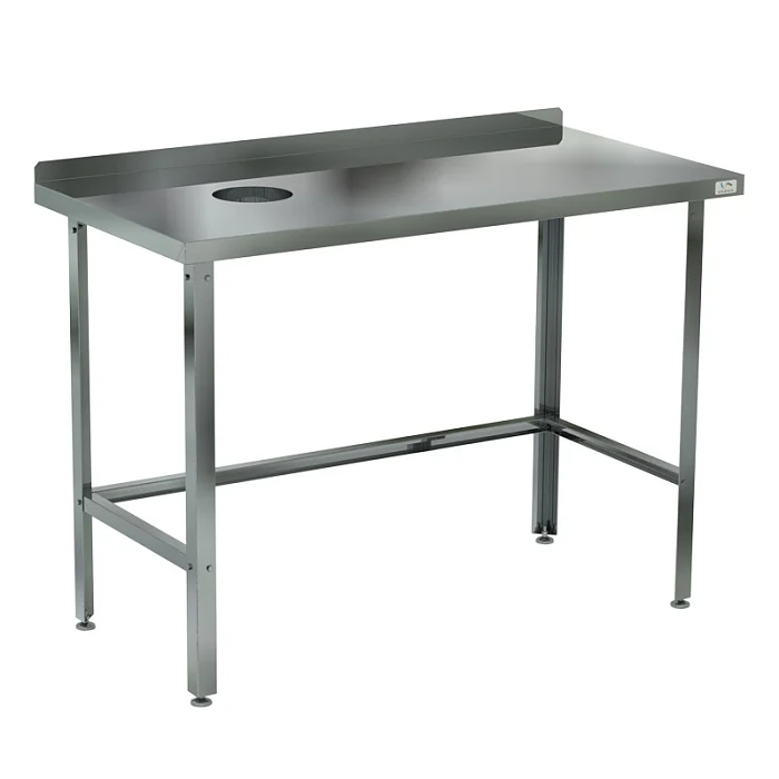 Стол для сбора пищевых отходов с бортом СРОБ-100/60 Л/П — это функциональное оборудование, которое используется не только для устранения отходов со столов, но еще и как рабочая поверхность. Сбоку в нем сделано отверстие, через него отходы сбрасываются в емкость, установленную под столом. Для смены или освобождения емкости после наполнения конструкция стола предусматривает обвязку ножек только с трех сторон. С противоположной стороны на столешнице установлен бортик. Он предотвращает загрязнение стены и пола частицами пищи. Купить стол в нашем магазине выгодно, благодаря доступным ценам и выгодным условиям доставки по Москве и в регионы. Обращайтесь прямо сейчас для оформления заказа. Возможно изготовление мебели из нержавеющей стали по Вашим чертежам и размерам. Для просчета возможности изготовления изделия, не представленного на сайте, и получения коммерческого предложения, просим обращаться к менеджерам компании по телефону или электронной почте.
