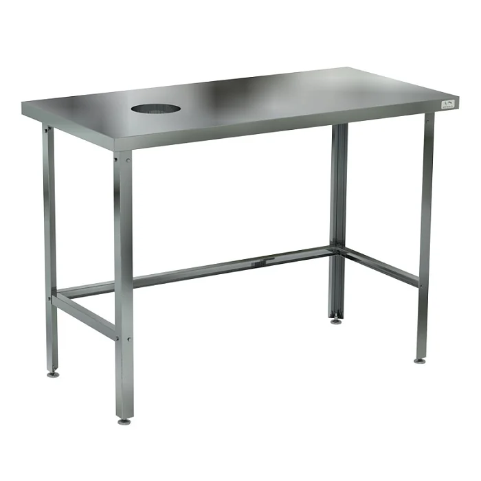 Стол для сбора пищевых отходов СРО-100/70/430 сделан с достаточно глубокой столешницей средней ширины. Сбоку в столешнице сделано отверстие, через которое удобно сбрасывать отходы в предназначенную для этого емкость, помещаемую под стол. Чтобы эту емкость можно было легко заменить или освободить после наполнения, в конструкции предусмотрена обвязка между опорами только с трех сторон. Каждую опору можно будет легко выставить по высоте так, чтобы сгладить любые неровности пола в помещении. Прямо сейчас покупайте практичный стол в нашем магазине, гарантирующем оперативную доставку по Москве и выгодные цены на все оборудование. Возможно изготовление мебели из нержавеющей стали по Вашим чертежам и размерам. Для просчета возможности изготовления изделия, не представленного на сайте, и получения коммерческого предложения, просим обращаться к менеджерам компании по телефону или электронной почте.