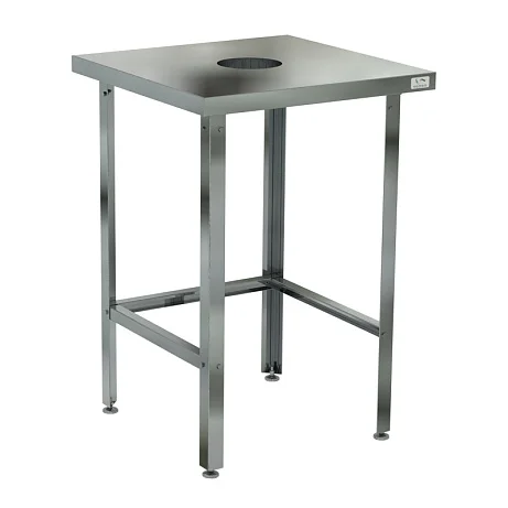 Стол для сбора пищевых отходов СРО-60/70. Снизу обвязка с трех сторон. Столешница стола изготовлена из нержавеющей стали aisi 430 и усилена с внутренней стороны листом ламинированной древесно-стружечной плитой толщиной 16 мм, что увеличивает прочность и исключает прогиб столешницы. В центре столешницы имеется отверстие 150 мм, под которым помещают емкость для сбора отходов. Каркас стола состоит из ножек, выполненных в виде уголка 40х40 мм из оцинкованной стали. Рекомендуемая нагрузка на стол не более 100 кг. Ножки стола имеют регулируемые по высоте опоры, позволяющие устранять неровности пола. Столы разделочные широко применяются в различных производственных цехах предприятий общественного питания, супермаркетах, комбинатах пищевой промышленности для разделывания и обработки пищевых продуктов, а также в качестве вспомогательной поверхности для кухонного оборудования.