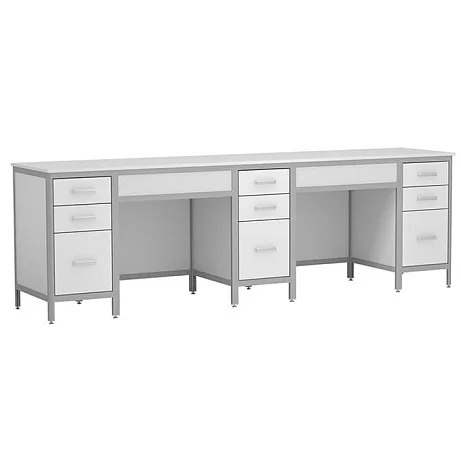 Стол лабораторный АСК СЛ.03.03 применяется в медицинских лабораториях для оборудования рабочих мест сотрудников. Стол оборудован тремя опорными тумбами, каждая из которых имеет по три выдвижных ящика. Винтовые опоры позволяют регулировать высоту ножек. Алюминиевый каркас обшит ЛДСП. Столешница изготовлена из МДФ толщиной 16 мм. Лучшая цена на стол лабораторный АСК СЛ.03.03 предложена в интернет-магазине МедМебель. Поспешите оформить заказ на сайте. Можно заказать услугу адресной доставки по Москве.