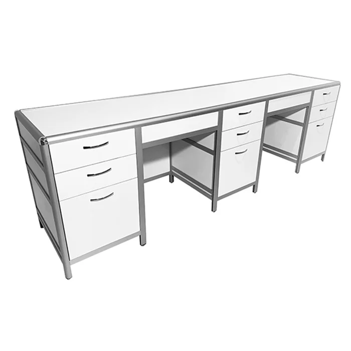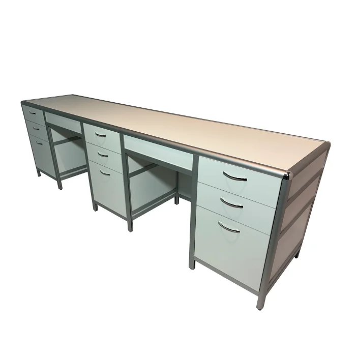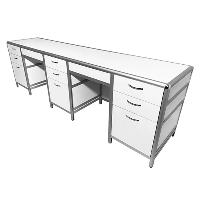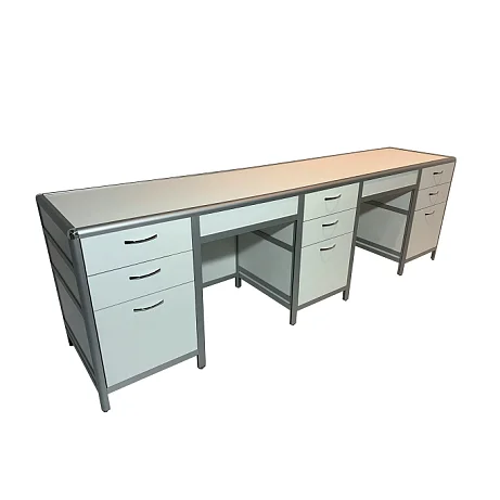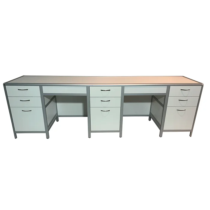 Для установки в лабораториях или других медучреждениях оптимально подойдет стол лабораторный MED 10.013al. Каркас выполнен из легкого алюминиевого профиля, который обеспечивает изделию хорошую прочность. Для обшивки стола используется ЛДСП толщиной 8 мм, а столешница изготавливается из ЛДСП (16 мм). Стол обеспечивает рабочими местами двух сотрудников. Под столешницей размещаются три тумбы с выдвижными ящиками. На ножках установлены опоры-регуляторы. Интернет-магазин «МедМебель» установил минимальную цену на стол лабораторный MED 10.013al. Мы может себе это позволить, так как являемся непосредственными производителями медицинской мебели. Доставка в любой город России осуществляется транспортными компаниями. В пределах Москвы товары развозит курьер.