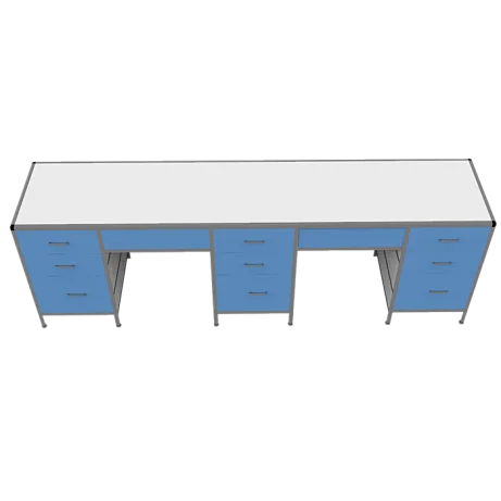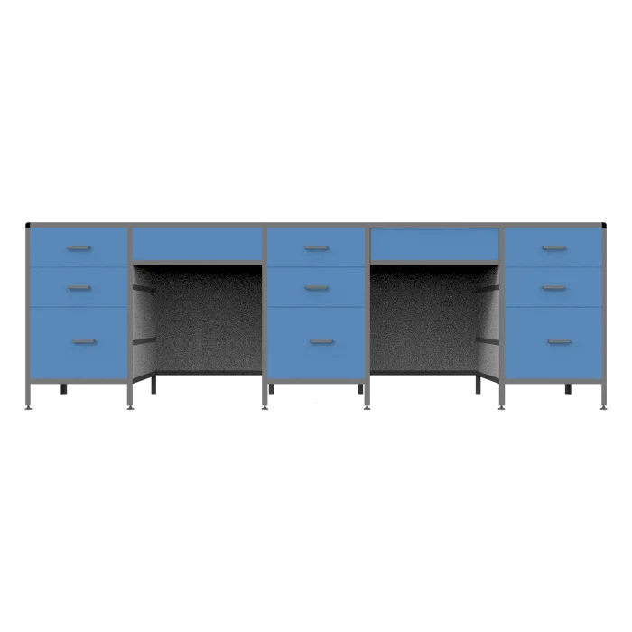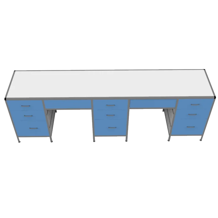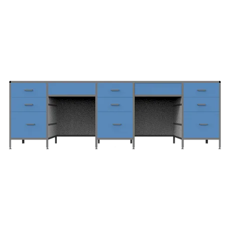 Каркас стола выполнен из алюминиевого профиля, обеспечивая отличную прочность и легкость конструкции. Три тумбы, каждая с тремя выдвижными ящиками, обеспечивают удобное хранение и организацию необходимых материалов и инструментов. Особенности модели включают столешницу из ЛДСП толщиной 16 мм с размерами 2700х600 мм и равномерной нагрузкой до 25 кг, обеспечивая просторное и надежное рабочее пространство.