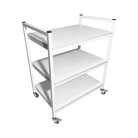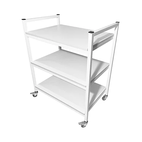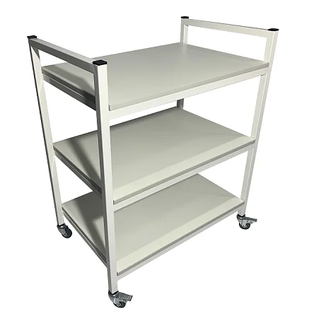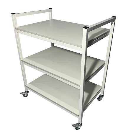 Стол лабораторный мобильный СЛм 17.005 предназначен для использования в медучреждениях и представляет собой конструкцию из каркаса, выполненного из покрытого порошковой краской стального профиля 25Х25 мм и трех полок из ЛДСП. Стойки оснащены колесиками диаметром 50 мм с тормозами, что позволяет свободно перемещать стол в пределах помещения. В качестве ручек для транспортировки стола можно использовать торцевые перемычки между стойками. Покупая стол лабораторный мобильный СЛм 17.005 в интернет-магазине «МедМебель», вы платите цену, установленную производителем. Отправка товаров в регионы производится с помощью транспортных компаний, по Москве работает курьерская служба.