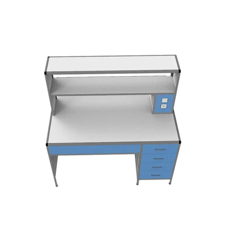 Столешница разделяется на две части надстройкой с двумя сквозными полками, которая также оснащена двумя брызгозащищенными розетками (по одной с каждой стороны) и двумя светодиодными светильниками под нижней полкой надстройки, что улучшает комфортность работы.