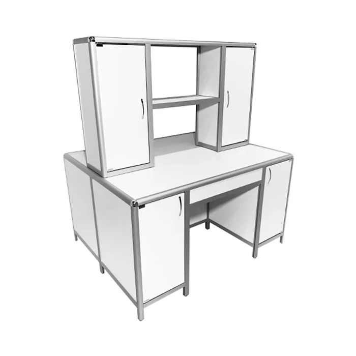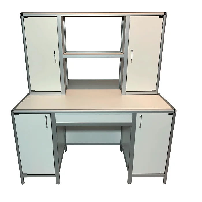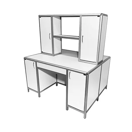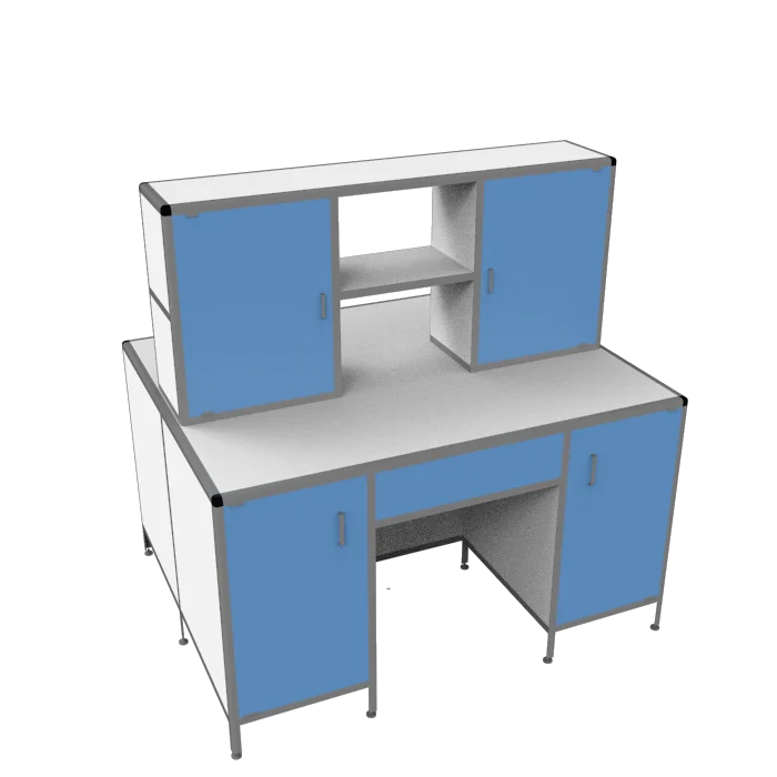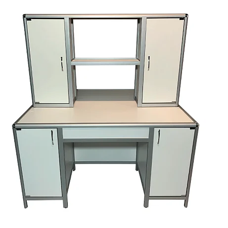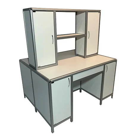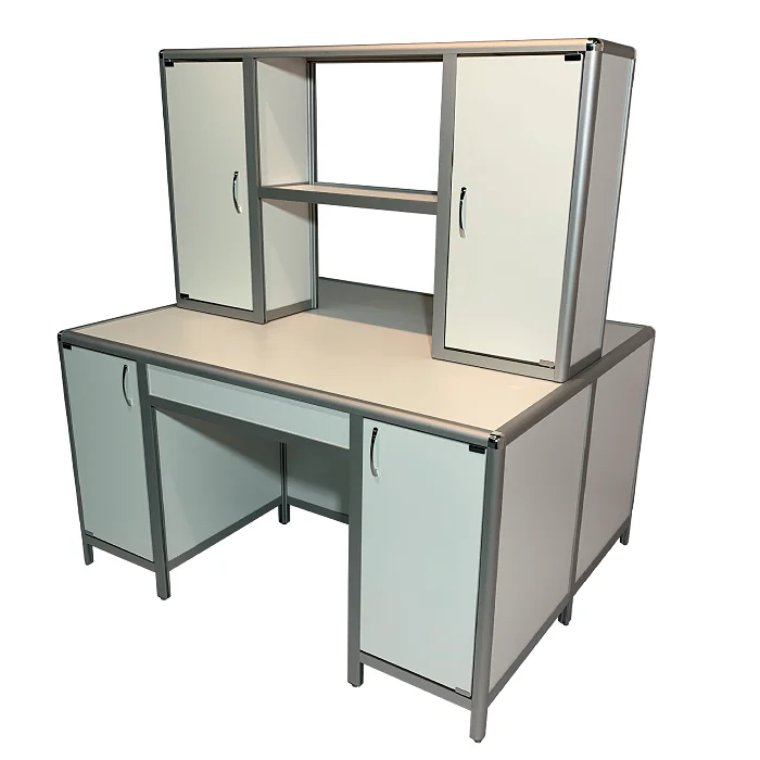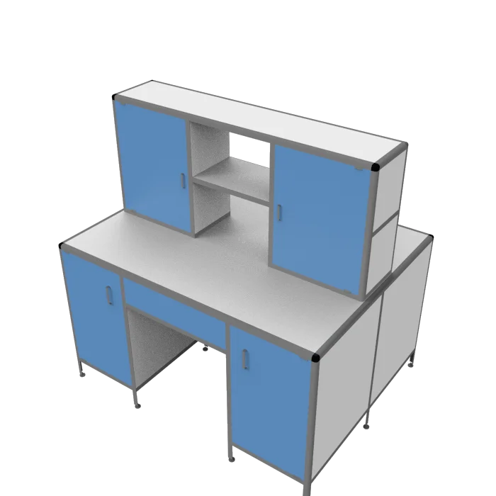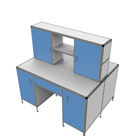Столешницу стола разделяет на два рабочих места надстройка с полкой между тумбами. Каждое рабочее место имеет надстройку, состоящую из двух боковых тумб с распашными дверками и полкой внутри, что обеспечивает дополнительное пространство для хранения.